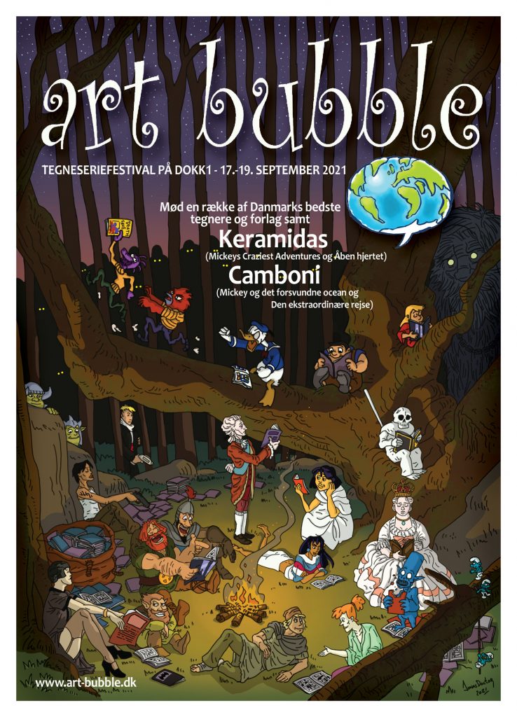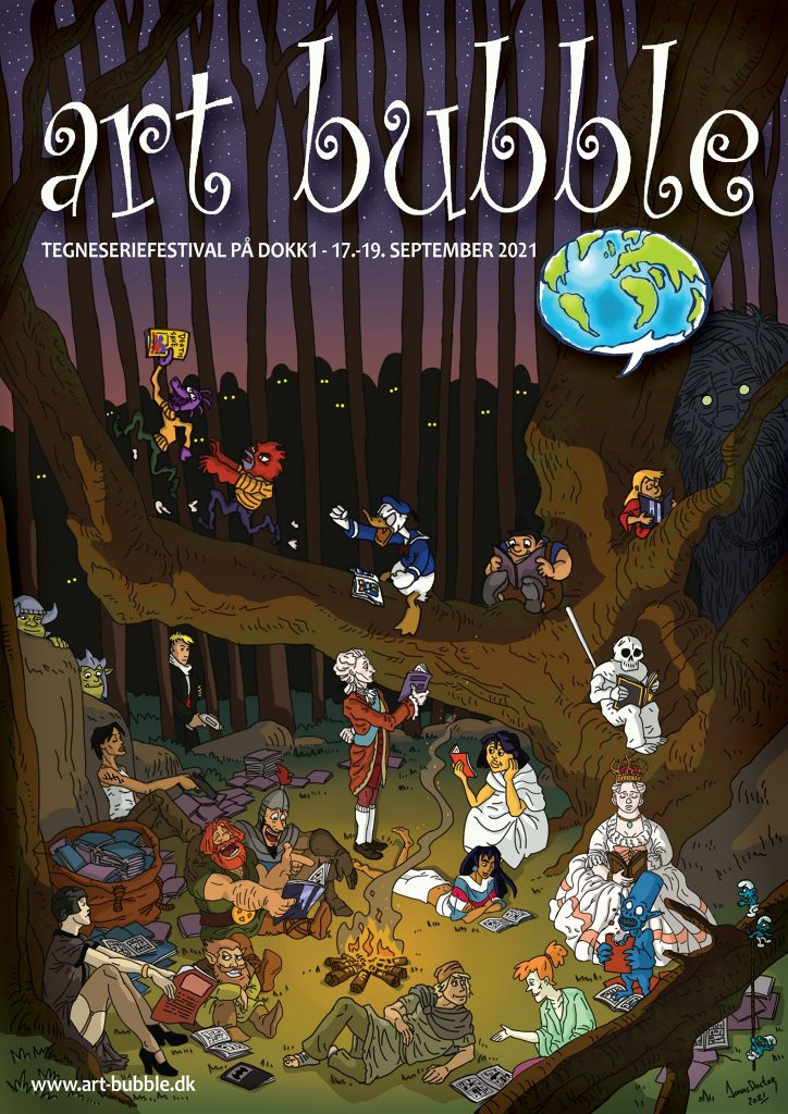 Jonas Doctor, der står bag en af sidste års bedste tegneserieudgivelser – Ridder Ivan – har tegnet årets Art Bubble plakat, hvor mange kendte danske og udenlandske tegneseriefigurer har fundet sig godt til rette i skoven. Hvor mange kan du mon genkende?